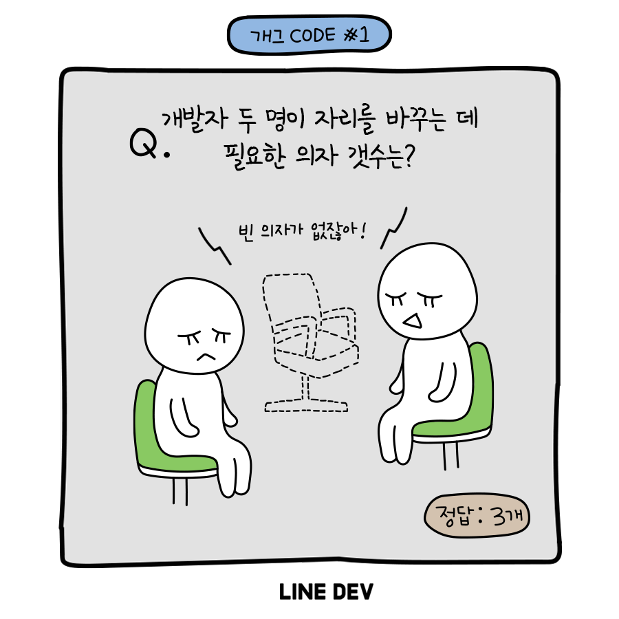 공대식 유우머 하지만 위 사진과 같은 프로그래머식 조크가 생길 정도로 대부분의 언어에서는 두 변수의 값을 교환하기 위해서는 세 개의 변수가 필요하다. 의자는 변수를 담을 공간을 비유하는 아주 괜찮은 메타포니, 사진을 이해하고 피식했다면 바로 다음으로 넘어가도 좋다.