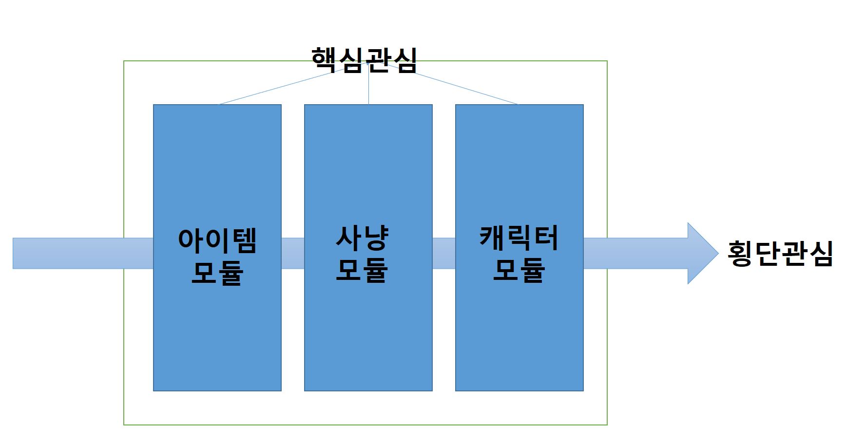 여기서 핵심 관심은 위 사진처럼 아이템, 사냥, 캐릭터 등이 될 수 있고 횡단 관심은 보안, 통계, DB 등의 그밖에 것들을 이야기한다. 이처럼 흩어진 횡단 관심사들을 Aspect로 모듈화하고 핵심 관심에서 분리하여 재사용한다는 것이 AOP의 취지이자 핵심이다.