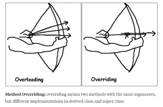 오버로딩과 오버라이딩에 대해서 알아보았다. 이름이 비슷하기 때문에 기억하기 힘들다고 생각한다면, 오버로딩의 loading 사전적인 의미에 집중해보자, 로딩은 짐을 싣다할 때 어떤 것에 운반해서 올리는 이미지다. FPS게임을 하면 "리로드!"라고 외치며 총알을 장전하는 모습을 충분히 상상이 가능할 것이다. 이때 총알을 운반에 총에 실어담는 Loading의 개념이 적용된 샘이다. 영어공부나 하자고 이런 이야기를 꺼낸 것은 아니고, 여기서 오버로딩 또한 같은 의미의 용어이다. 위의 사진처럼 여러개의 메소드를 실어 담아놓아서 여러 개의 방향으로 쏠 수 있는 하나의 거대한 메소드를 만드는 것이다. 다만 여기서 주의해야할 것은 화살 하나 하나가 다른 재질(매게 변수)를 지녀야 한다는 점이다.