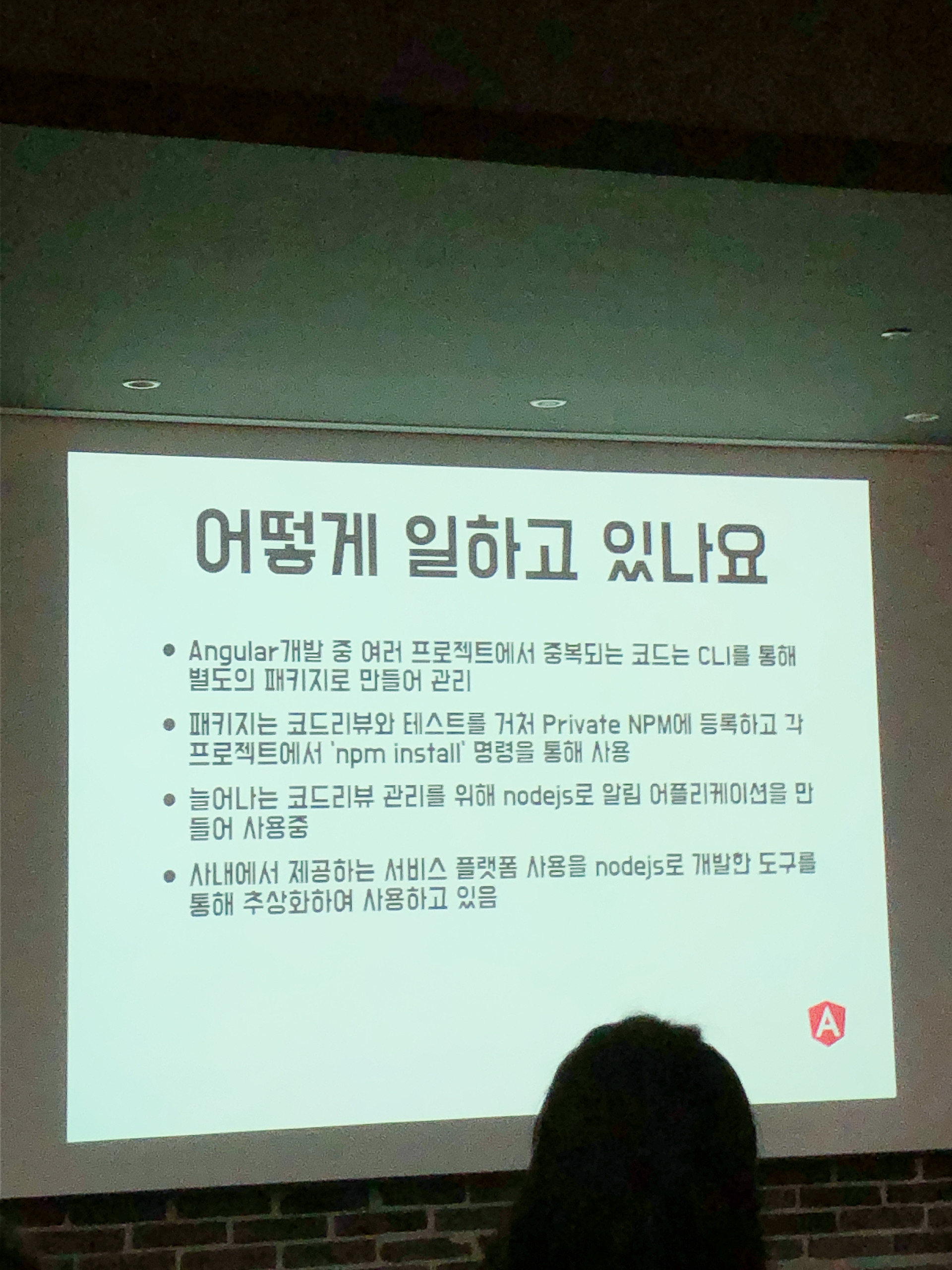 여담으로 Angular 개발자 수급이 어려워서 팀원을 뽑고 있다고 많은 지원을 바란다고 강연자분이 말씀하셨습니다. 앵귤러가 리액트나 뷰에 비해서 가장 프레임워크화 되어있고 패턴이 정형화 되어있어서 거대 프로젝트나 규모가 좀 있는 팀에서 채택하기 좋은 프레임워크는 확실하지만 반면에 배워야할 것 알아야 할 것 등 러닝커브가 좀 있는 편이라서 그에 비례해서 개발자 수급도 어려운 것 같습니다.