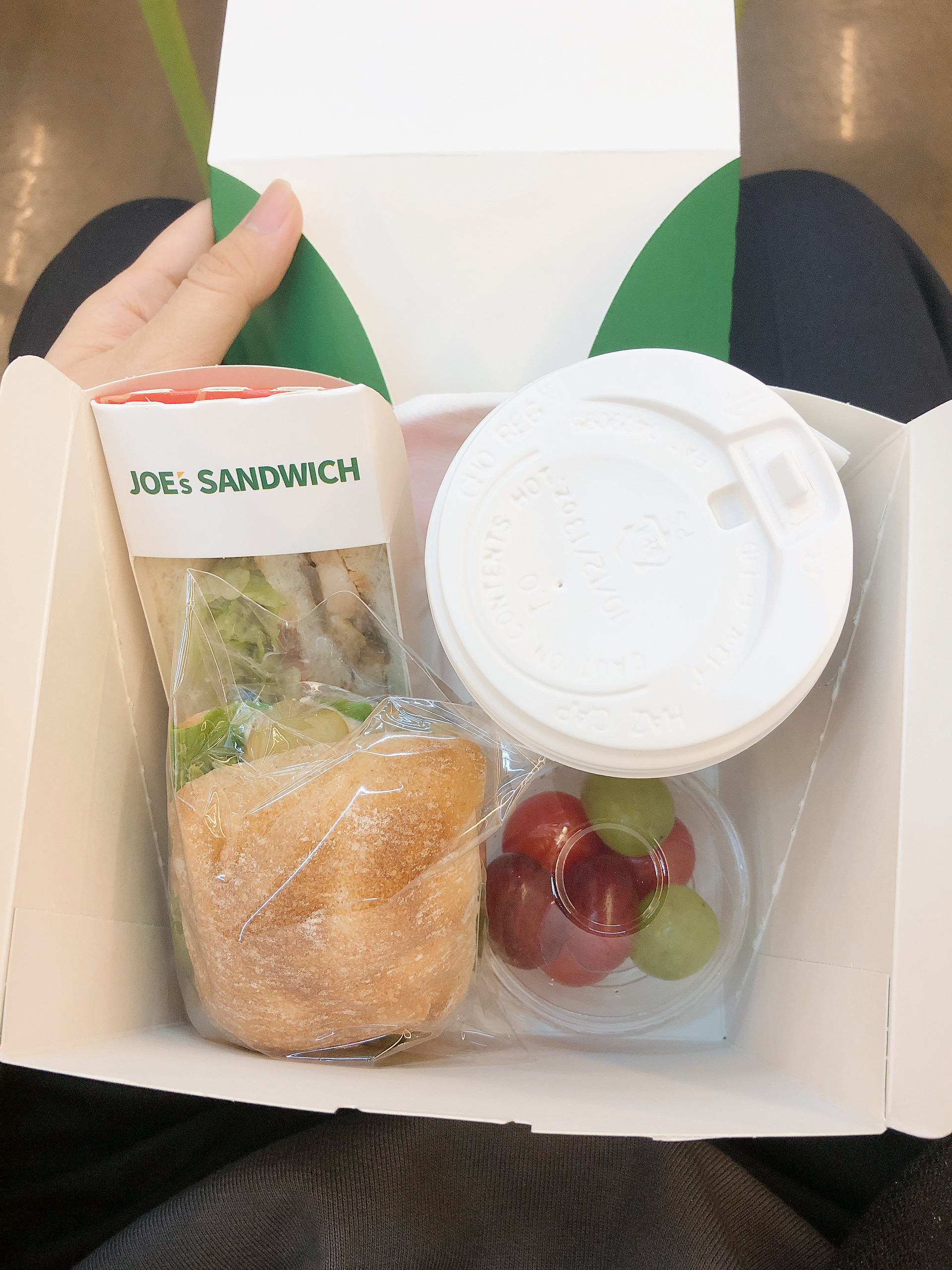 들어가자마자 나눠준 샌드위치와 과일, 일회용 컵, 물