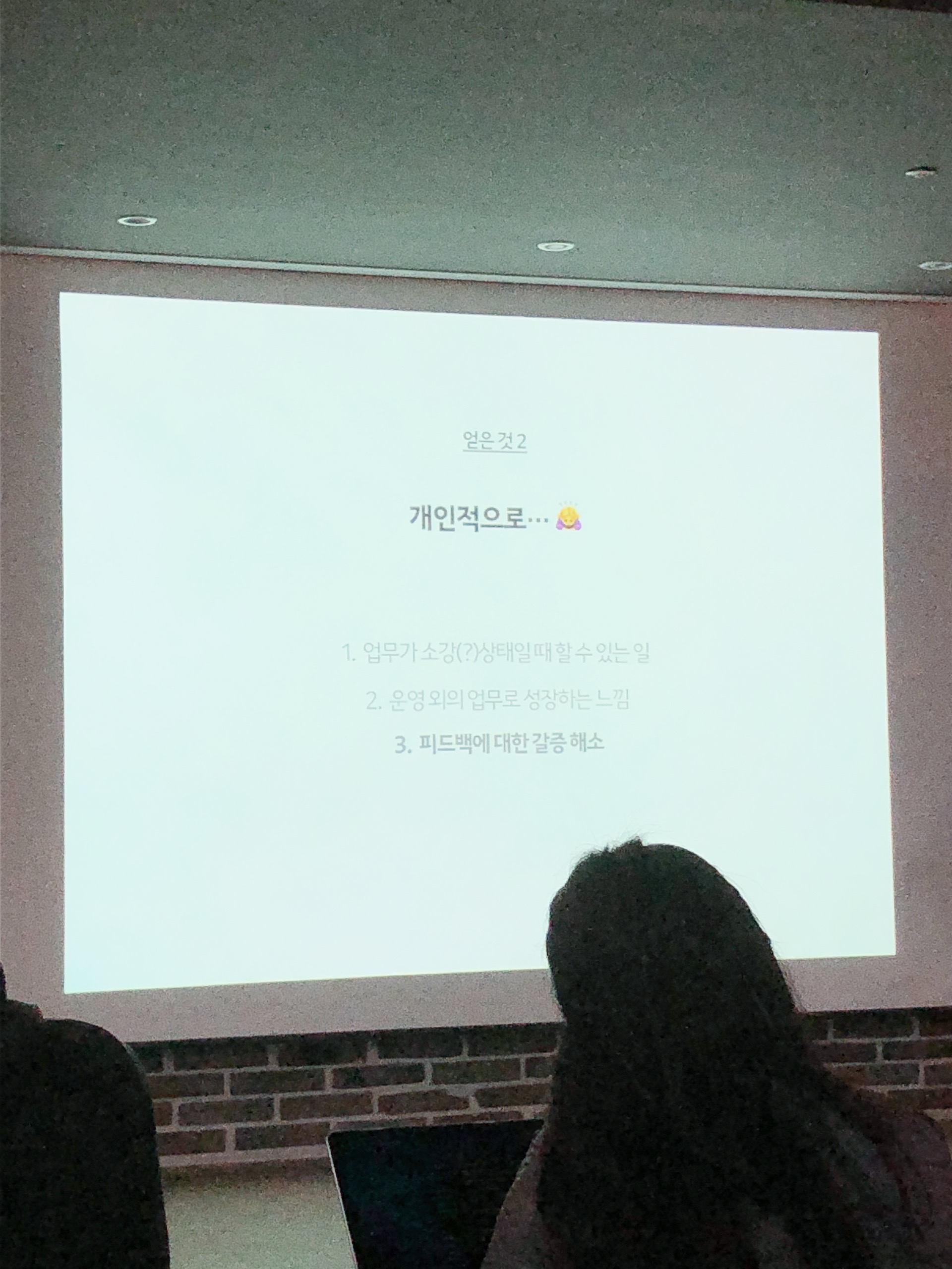 처음 갔었을 때는 살짝 일정 시작 시간보다 늦어서 다른 분들에게 방해될까봐 거의 뒷자리에 앉아서 사진도 강연자분 얼굴이 확인이 불가능할 정도인데, 실제로는 저렇지 않고 화면도 중간에 프리젠테이션을 보여주는 모니터가 따로 있어서 뒷편에 앉았더라도 프리젠테이션을 보는데는 문제가 없었습니다.