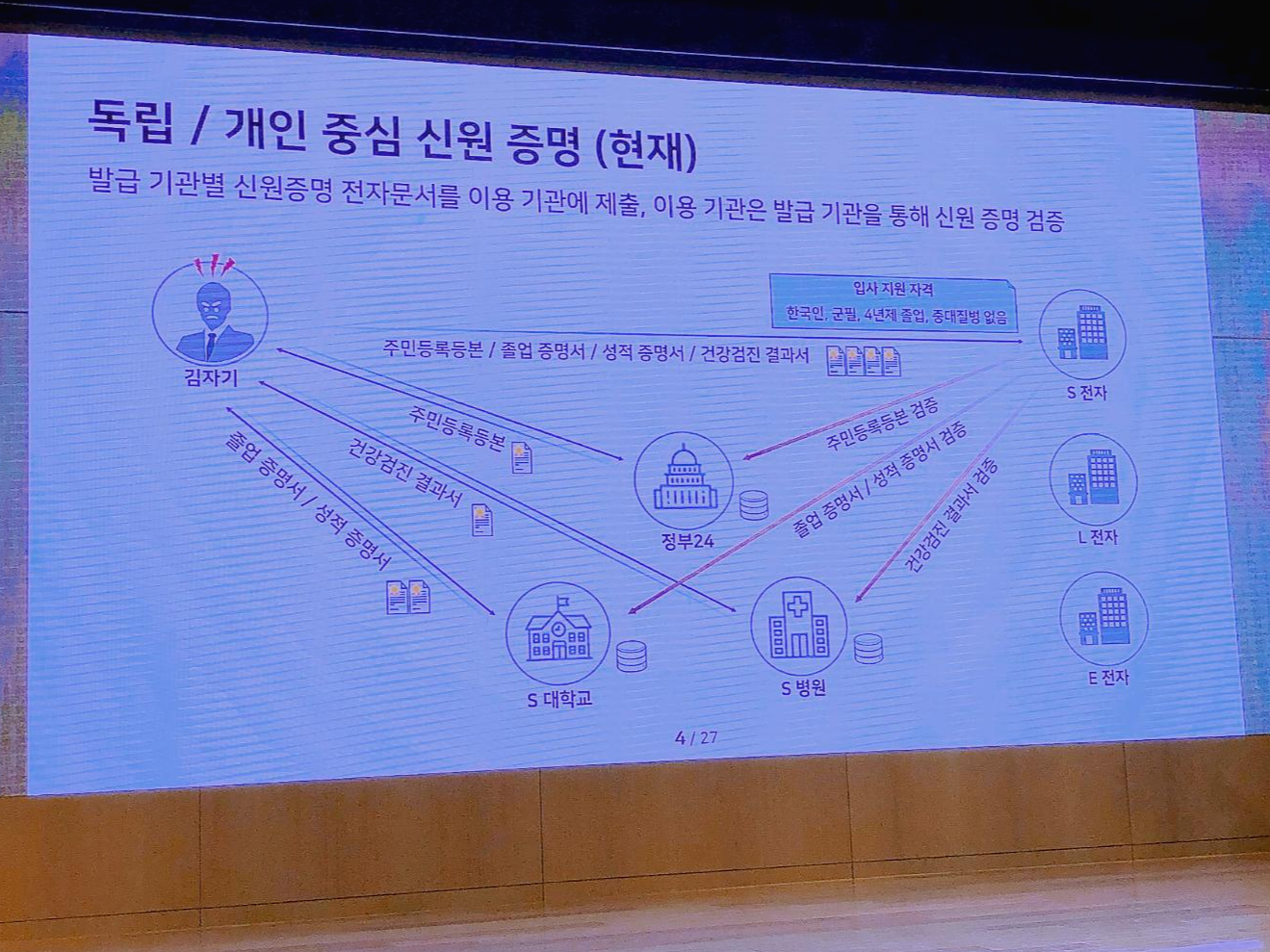 기존의 신원 증명을 위해서는 절차가 상당히 복잡했습니다. 필요한 서류도 많았죠. 예를 들어서 회사에 입사한다고 했을 때, 회사에서는 주민등록등본과 졸업 증명서, 성적 증명서, 건강검진 결과서 등을 요구한다고 가정을 해봅시다.