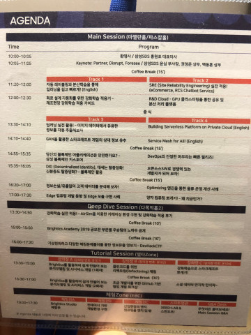 인식표 뒤편에 진행되는 세션을 시간별로 간략하게 타임테이블을 확인할 수 있습니다. 너무 글씨가 작죠? 실제로 진행되는 세션에 대해서 자세하게 알고 싶으신 분들은 공식 홈페이지에서 제공하는 정보를 확인하실 수 있습니다.(https://www.samsungsds.com/global/ko/about/event/techtonic2019.html)
