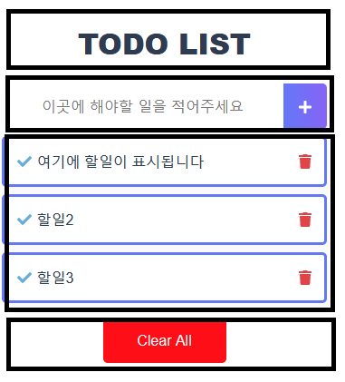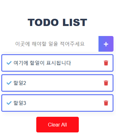위 사진은 우리가 만들어볼 할일 관리 앱의 완성본이다. 반응형으로 구성되어 웹 뿐만 아니라 모바일에서 봐도 문제가 없도록 UI를 구성하였다. 할 일을 input에 적어서 +버튼을 누르면 목록에 추가되고 휴지통 아이콘을 눌러서 낱개로 지우거나 Clear All버튼을 눌러서 한번에 다 지우는 것도 가능하다.