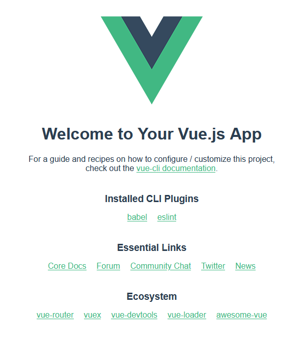 yarn serve # 또는 yarn run serve이제 만들어진 프로젝트 폴더로 이동해서 위 명령어를 쳐서 앱을 실행시켜보면 프로젝트가 생성되어 localhost:8080으로 접속하면 기본페이지로 연결되는 것을 확인할 수 있다.