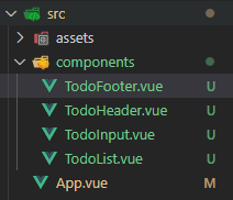 import TodoHeader from "./components/TodoHeader.vue"; import TodoInput from "./components/TodoInput.vue"; import TodoList from "./components/TodoList.vue"; import TodoFooter from "./components/TodoFooter.vue"; export default { name: "App", components: { TodoHeader, TodoInput, TodoList, TodoFooter } };style부분은 일단 그대로 두자.