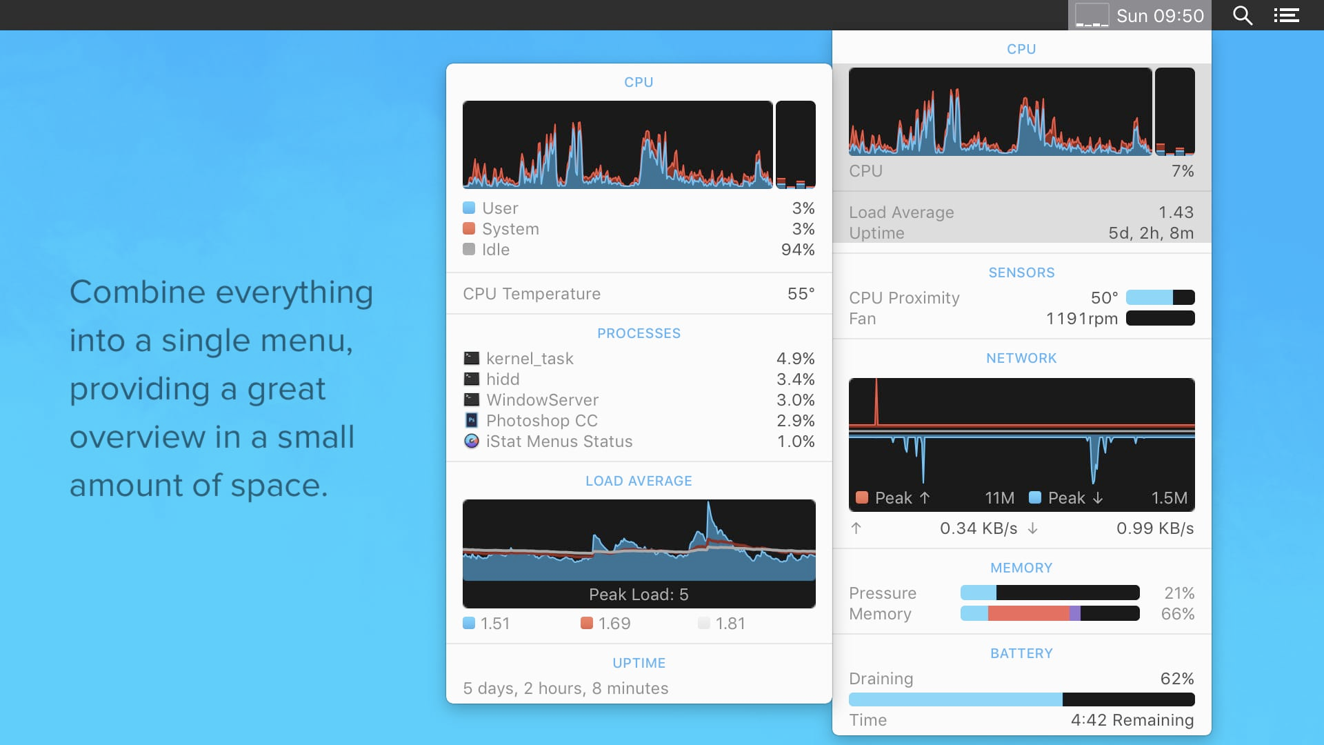 An advanced Mac system monitor for your menubar, with CPU, GPU, memory, network, disk usage, disk activity, temperatures, fans, battery info and more.