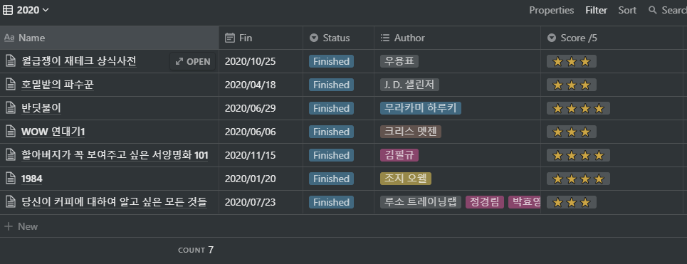 책 또한 7권으로 작년에 비하면 미미하게 늘어난 수준이기는 하지만 역시나 취업공부 때문에 잠시 우선순위를 뒤로 미루어뒀기 때문이라고는 쳐도 목표로한 30권에는 턱없이 부족한 수준이다.