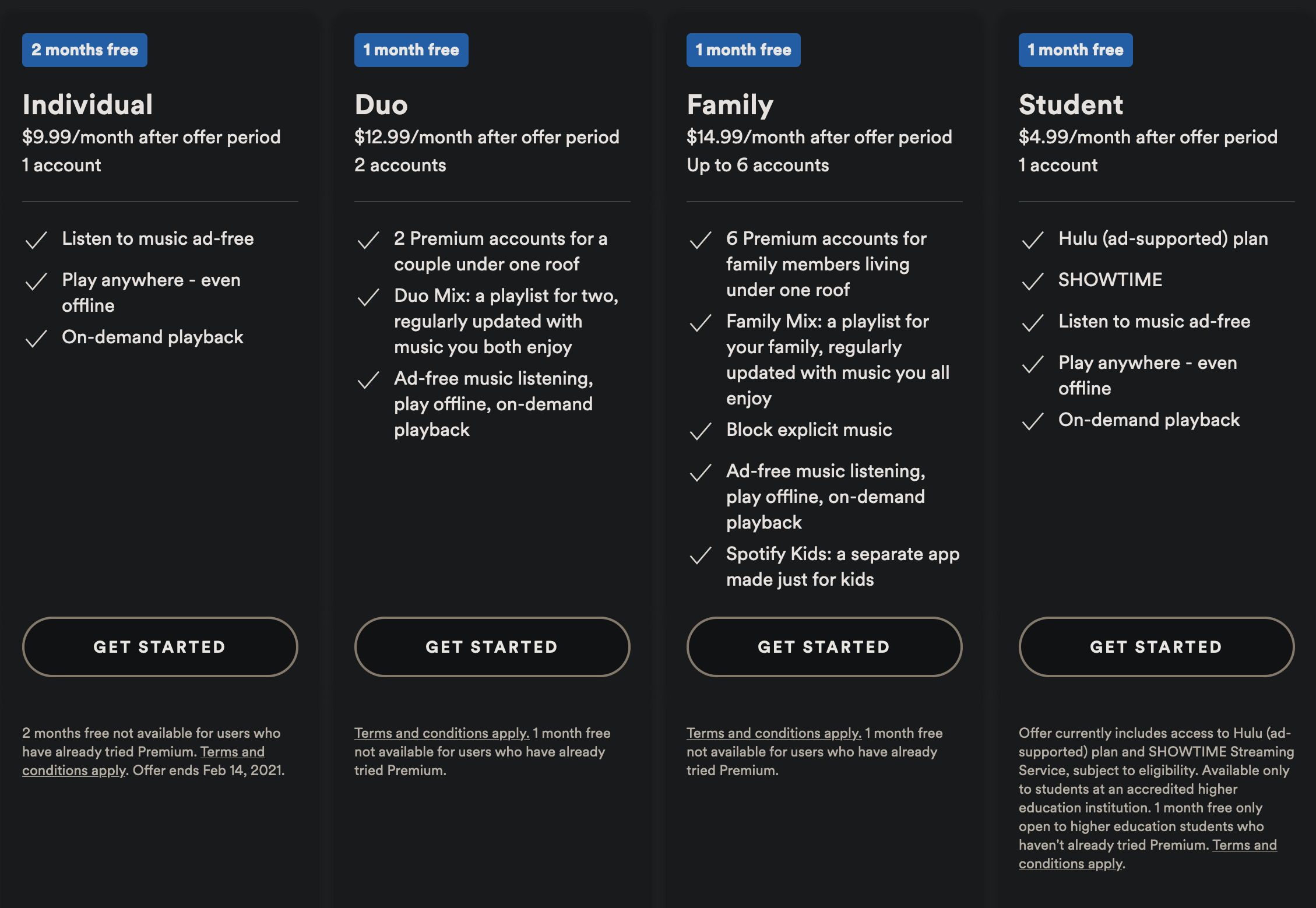 국내에 런칭한 요금 플랜은 위처럼 개인과 듀오만 제공합니다. 가격은 멜론의 스트리밍 플러스 기준으로 10900원으로 동일한 가격이지만 국내 스트리밍 서비스들은 대부분 통신사 할인이나 이것저것 할인 받을 수 있는 루트가 많다는 것을 감안한다면 그리 싼 가격은 아닌 셈이죠.