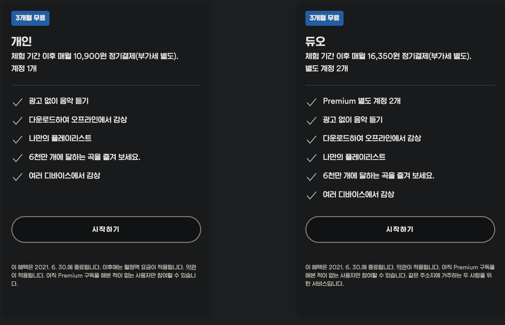 국내에 런칭한 요금 플랜은 위처럼 개인과 듀오만 제공합니다. 가격은 멜론의 스트리밍 플러스 기준으로 10900원으로 동일한 가격이지만 국내 스트리밍 서비스들은 대부분 통신사 할인이나 이것저것 할인 받을 수 있는 루트가 많다는 것을 감안한다면 그리 싼 가격은 아닌 셈이죠.