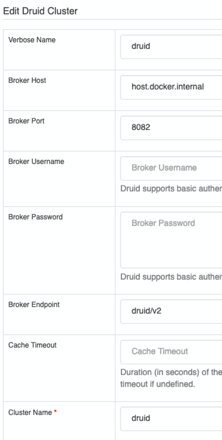 위와 같이 설정, 드루이드는 로컬에 설치하고 superset은 도커 상에 설치되어 있을 때는 Broker Host를 host.docker.internal 로 잡아 주어야 한다. 따로 localhost의 특정 포트와 이어주는 방법도 있지만 이것은 도커의 설정이므로 이 문서에서는 생략하도록 한다.