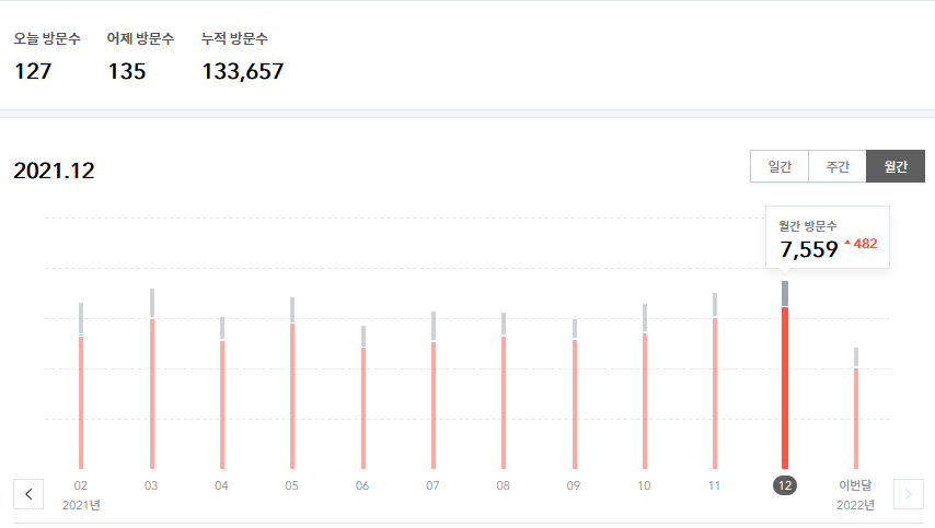 작년에 목표로 했던 21년도 누적 방문자수 10만명 돌파해 어느덧 14만명을 향해 달려가고 있다. 올해는 20만을 목표로 계속해서 이 텐션을 유지해보려고 한다.