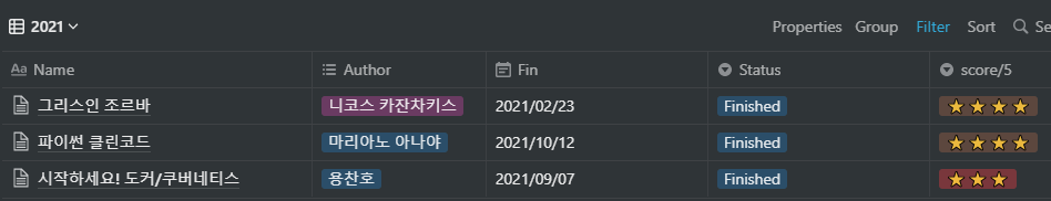 역시나 매해 계획에 책을 읽겠다고 적어놨지만 21년도에는 컴퓨터 관련 서적 외에는 단 한권밖에 읽지 못했다. 전공서적을 포함하더라도 원래 목표했던 10권에는 턱없이 모자라는 수치이다. 아무리 일이 바쁘고 이리핑계 저리핑계를 대더라도 매해가 갈수록 점점 줄어들어서 올해에는 아예 0에 수렴하게 될지도 모른다는 생각이든다. 10권정도는 실현가능한 목표라고 생각했었는데...