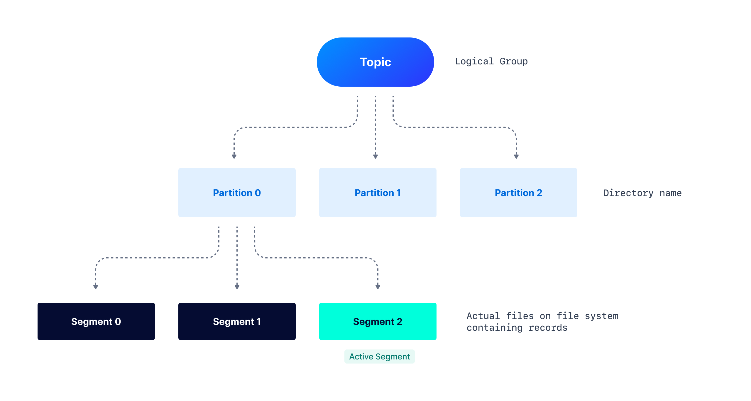 - 토픽의 메세지들은 파티션으로 나뉘며, 각 파티션들은 세그먼트로 분류할 수 있다.