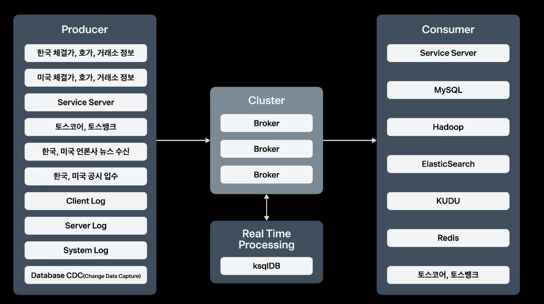 사용자에게 실시간으로 제공하는 거래소정보, 로그, 분석 등에 카프카를 활용하고 있음