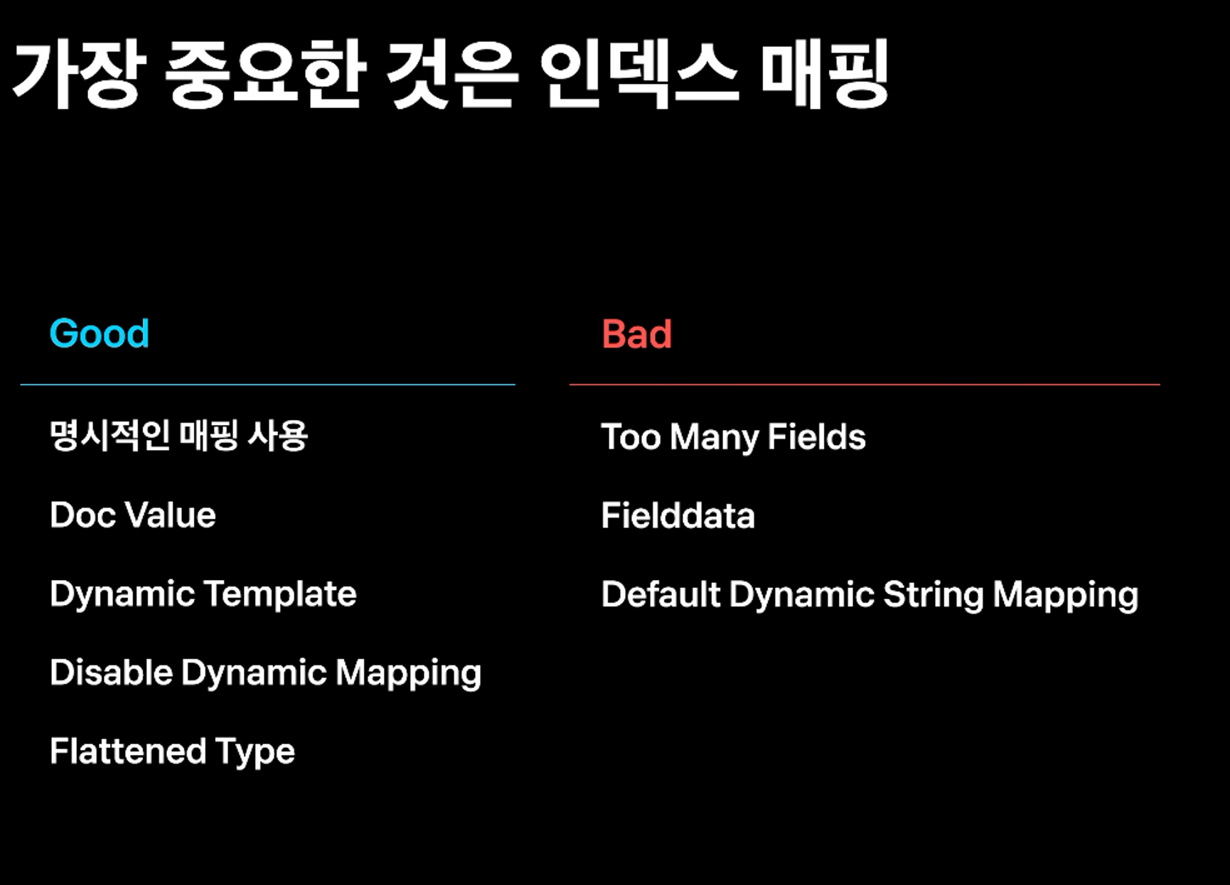 따라서 동적 필드 매핑을 사용하지 말고 구조화되지 않은 문자열이 들어가는 필드는 text타입, 그 외에는 keyword, numeric등으로 맵핑되도록 하는 것이 중요
