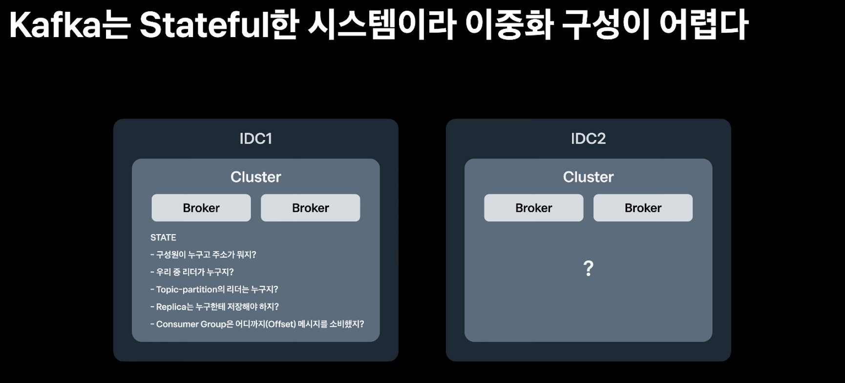 특이한 건 한쪽 IDC만 컨슈머가 존재함→메세지 미러링을 통해서 전체 합치면 메세지양이 200%가 되기때문에 컨슈머가 양쪽에 붙으면 두 배 중복해서 소비하는 상황을 방지하기 위해서