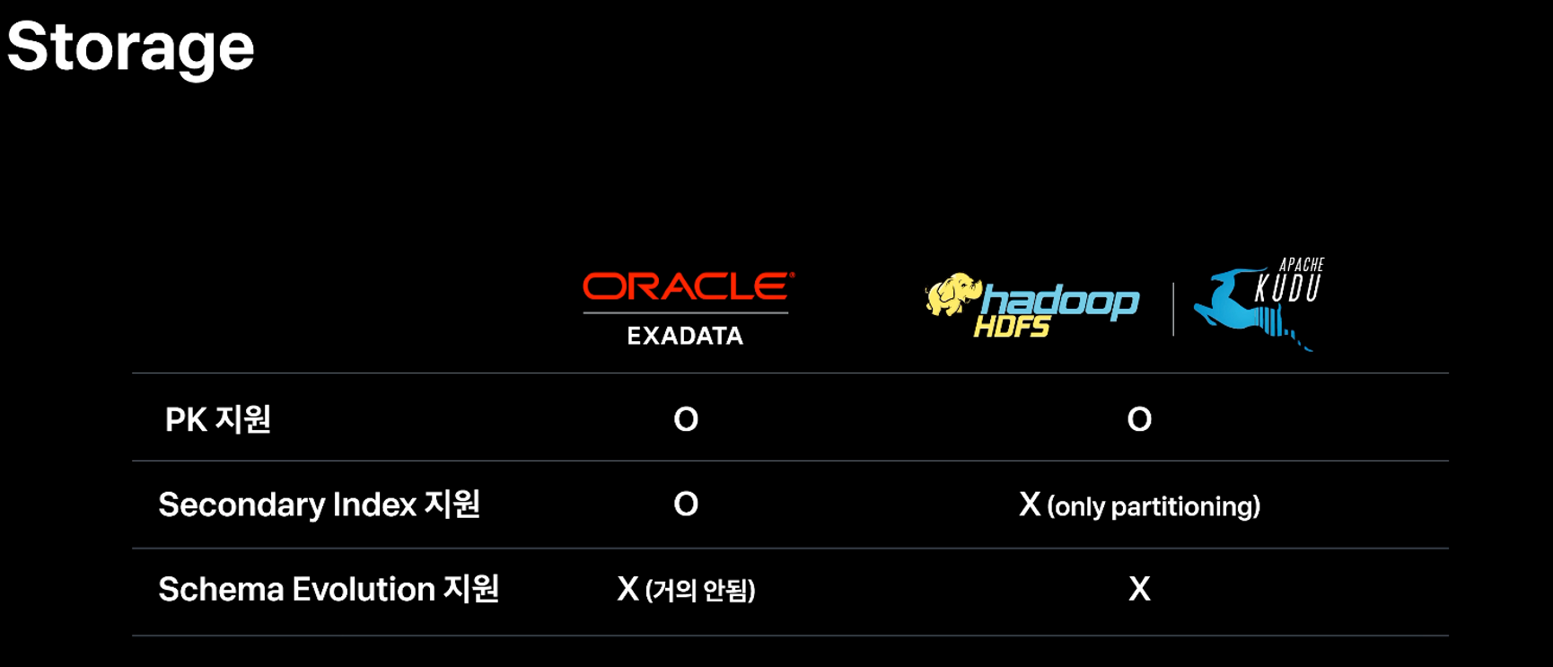 반면 스파크는 암시적 형 변환이 지원되고 오라클 문법 대부분 지원됨(단, Merge Into는 delta Lake, Hudi, IceBerg와 같은 스토리지 필요→100개 넘는 배치 프로그램 바꾸는데 1명의 개발자가 1달도 안걸리는 등 임팔라 대비 비용 축소