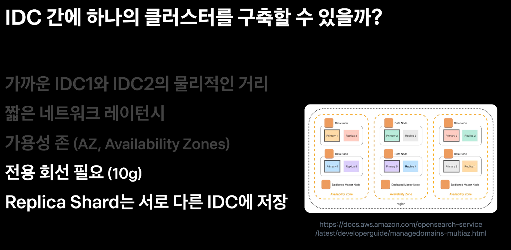 노드들이 빈번하게 통신하는데 데이터 센터 간의 네트워크 레이턴시가 높으면 클러스터 전체적으로 성능저하가 발생해 엘라스틱 서치에서는 권장하지 않음