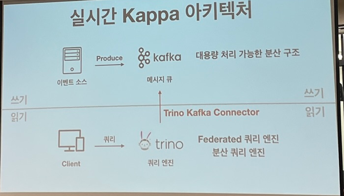 - 이벤트를 트리노 카프카 커넥터를 통해 읽음→한계가 있음 낮은 저장 효율로 장기 데이터 저장소로 활용하기 힘듬