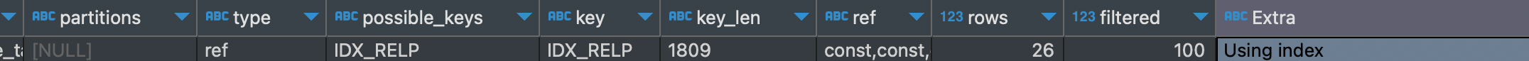 EXPLAIN 쿼리의 결과 값 중에서 Extra 컬럼을 확인해보면 다음과 같은 표기로 나뉜다.- Using Where: DB의 엔진으로 필터링 될 때 Using where로 풀림 즉, 스토리지 엔진에서 불필요하게 많은 데이터로 엑세스 한다는 의미이므로 인덱스 설계가 제대로 되지 않았을 가능성이 높음
