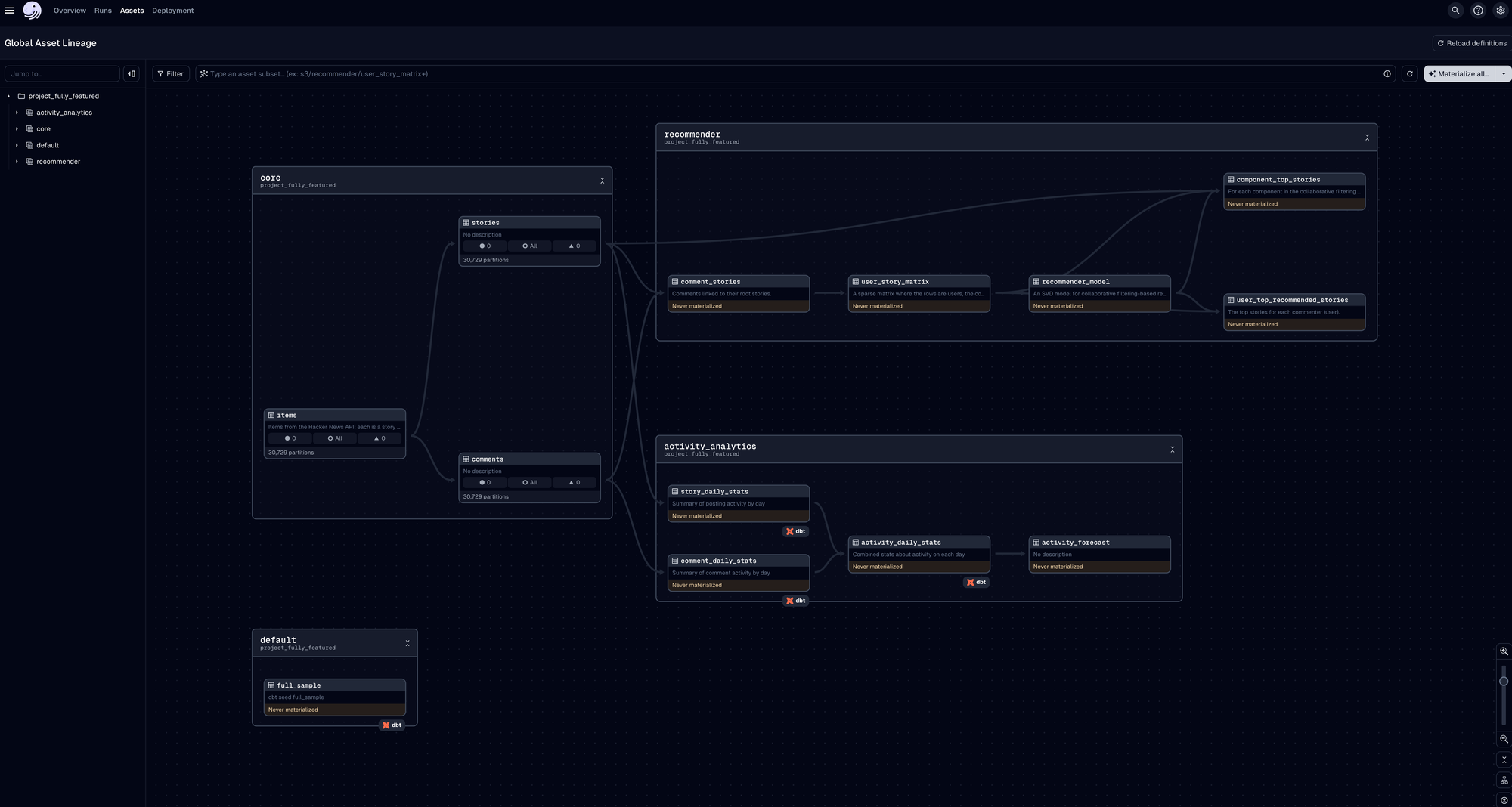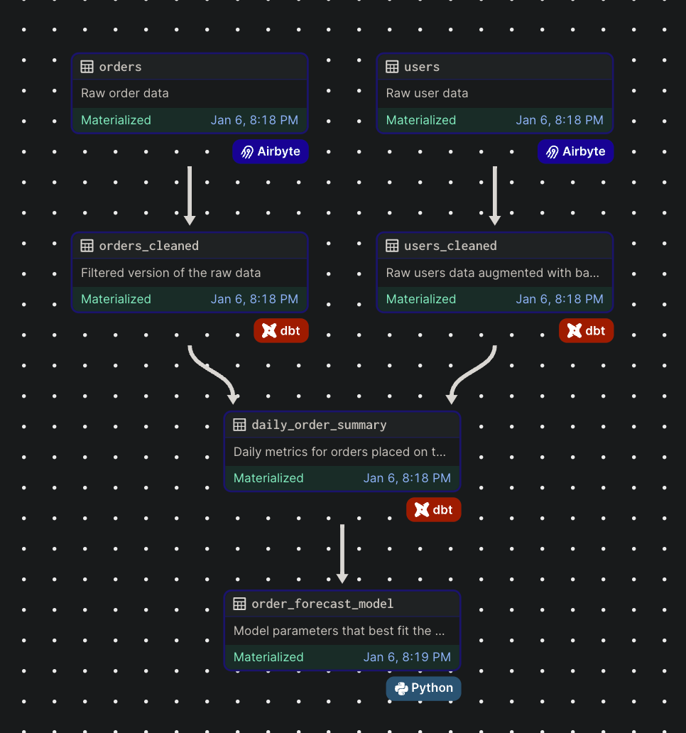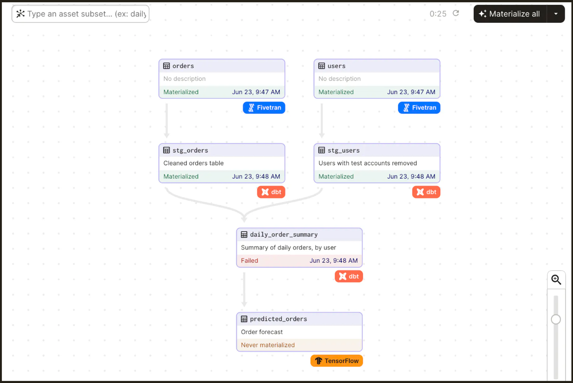- dbt, snowflake, csv, Fivetran, TensorFlow 등 다양한 에셋을 통해 데이터를 모델링할 수있음→airflow의 오퍼레이터와 유사하지만 좀더 가시적으로 보고 관리할 수 있음