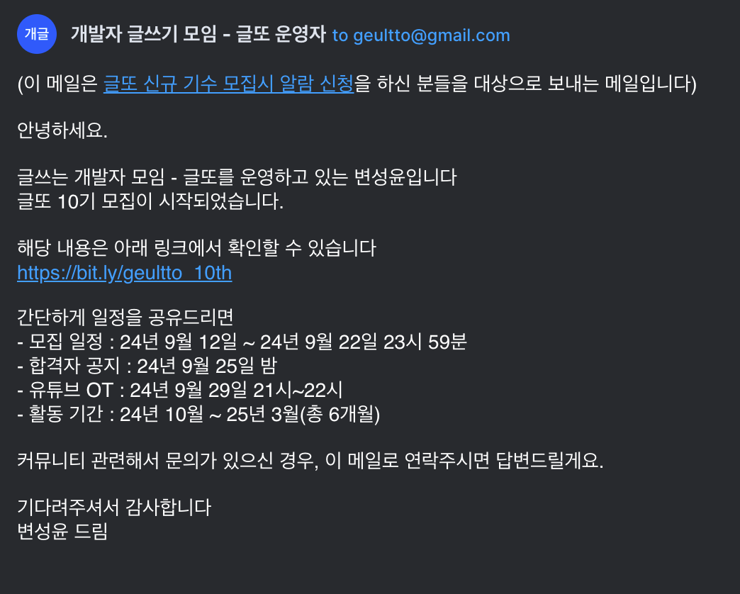 하지만 내가 글또를 통해 발행된 글들을 보고있을 때는 이미 해당 기수의 모집이 끝났을 때였고 나는 아쉬움을 뒤로하며 다음 기수가 시작할 때 알람을 받을 수 있도록 메일을 등록해두었다.