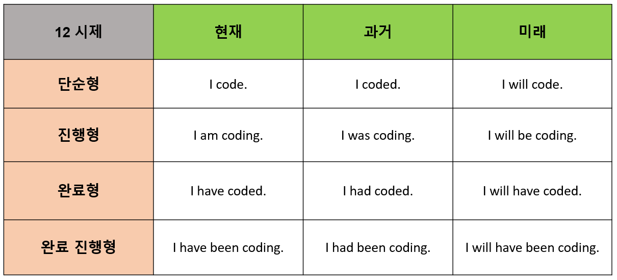 영어 시제에는 현재, 과거, 미래 시제가 있고 각 시제는 단순형, 진행형, 완료형, 완료 진행형으로 이뤄져 있다.